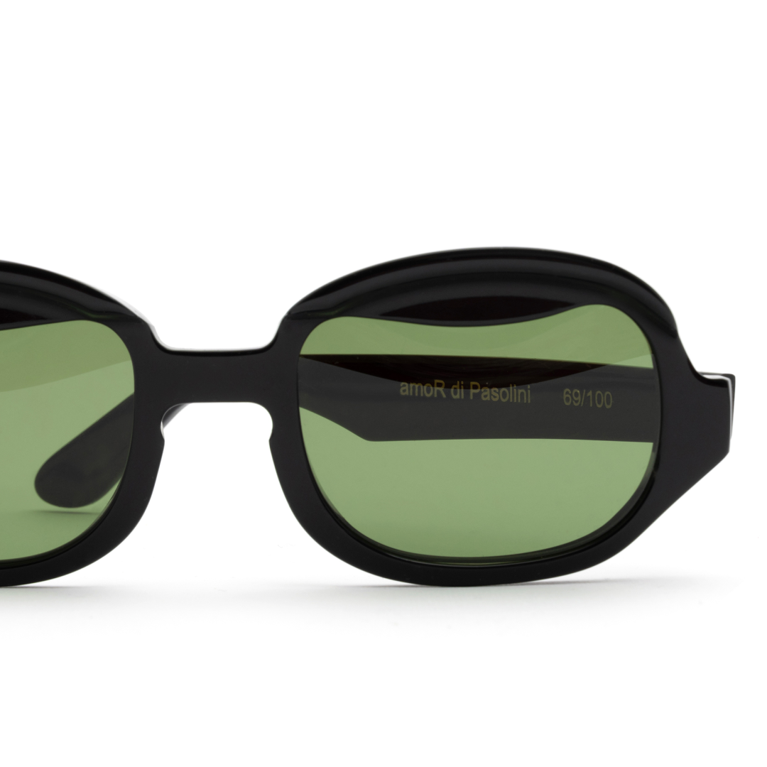 Al maestro che ha descritto con tanto amore l’anima della città, il brand ha dedicato amoR- una limited edition prodotta in soli 100 pezzi numerati che desidera ancorare al lungomare da lui tanto amato, PierPaoloPasolini. Il design della montatura è ispirato proprio agli occhi dell’artista- incavati e sognanti. Una montatura total black, semi ovale ma caratterizzata da una forma completamente inedita: un ciliare che sembra essere socchiuso, omaggio agli occhi malinconici del poeta, ma sovrastata da una visiera color bottiglia sempre annessa al frontale, che simboleggia lo sguardo aperto, volto al futuro e privo di costrizioni di Pasolini.